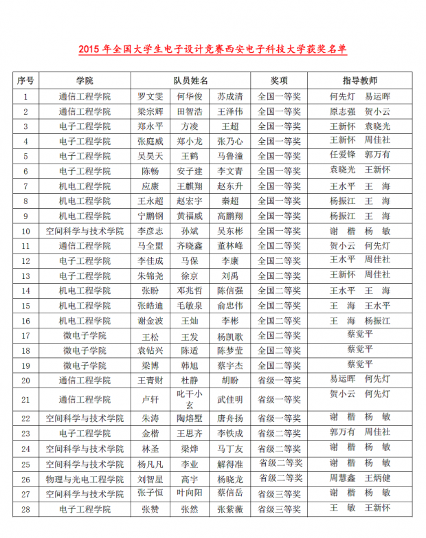 全国大学生电子设计竞赛两年一届,是由教育部高等教育司、工业和信息化部人事教育司主办、全国大学生电子设计竞赛组委会承办的一项重要的全国性大赛。本届竞赛共有来自全国31个省、自治区和直辖市的1097所高校、13063支代表队,共计39189名同学报名参赛。赛事历时四天三夜,后经全国竞赛专家组评审、全国竞赛组委会批准,272个参赛队获全国一等奖(获奖比例2.1%),645个参赛队获全国二等奖(获奖比例4.9%)。其中陕西赛区共获国家一等奖12项,国家二等奖43项。