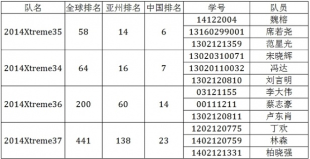 我校新闻网讯(通讯员 李隐峰)近日,IEEE美国电气电子工程师学会公布第八届IEEE极限编程全球大赛(IEEEXtreme 8.0)正式比赛结果。西安电子科技大学有4支队伍12名同学参加本届编程大赛,参赛队伍由本校电子工程院、计算机学院、空间科学与技术学院和微电子学院4个学院的本科生以及研究生组成。本届比赛中,我校所有参赛队伍均进入全球前500名,2014Xtreme35和2014Xtreme34两支参赛队成功晋级全球前100名,分别斩获第58名和64名的成绩(全球1830支参赛队),刷新了我校在此竞赛中的最好成绩。另外两支队伍获得世界200名和441名的成绩。本次竞赛由beat365李隐峰副教授担任指导教师并负责竞赛环境技术保障。