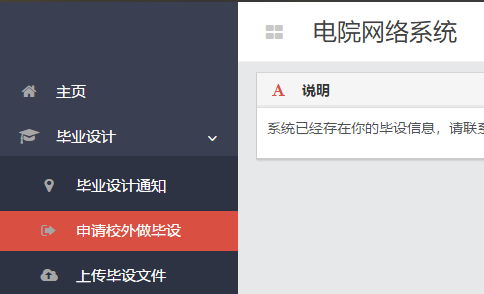 3)赴外做毕业设计的学生填写《西安电子科技大学赴外做毕业设计(论文)申请表》(表格下载:教务处实践教学网 http://sjjx.xidian.edu.cn ),并于2019年1月10日前将纸质版提交至学院办公室(图书馆438)潘老师处,电子版提交至我院系统(dyxt.xidian.edu.cn),如下图所示: