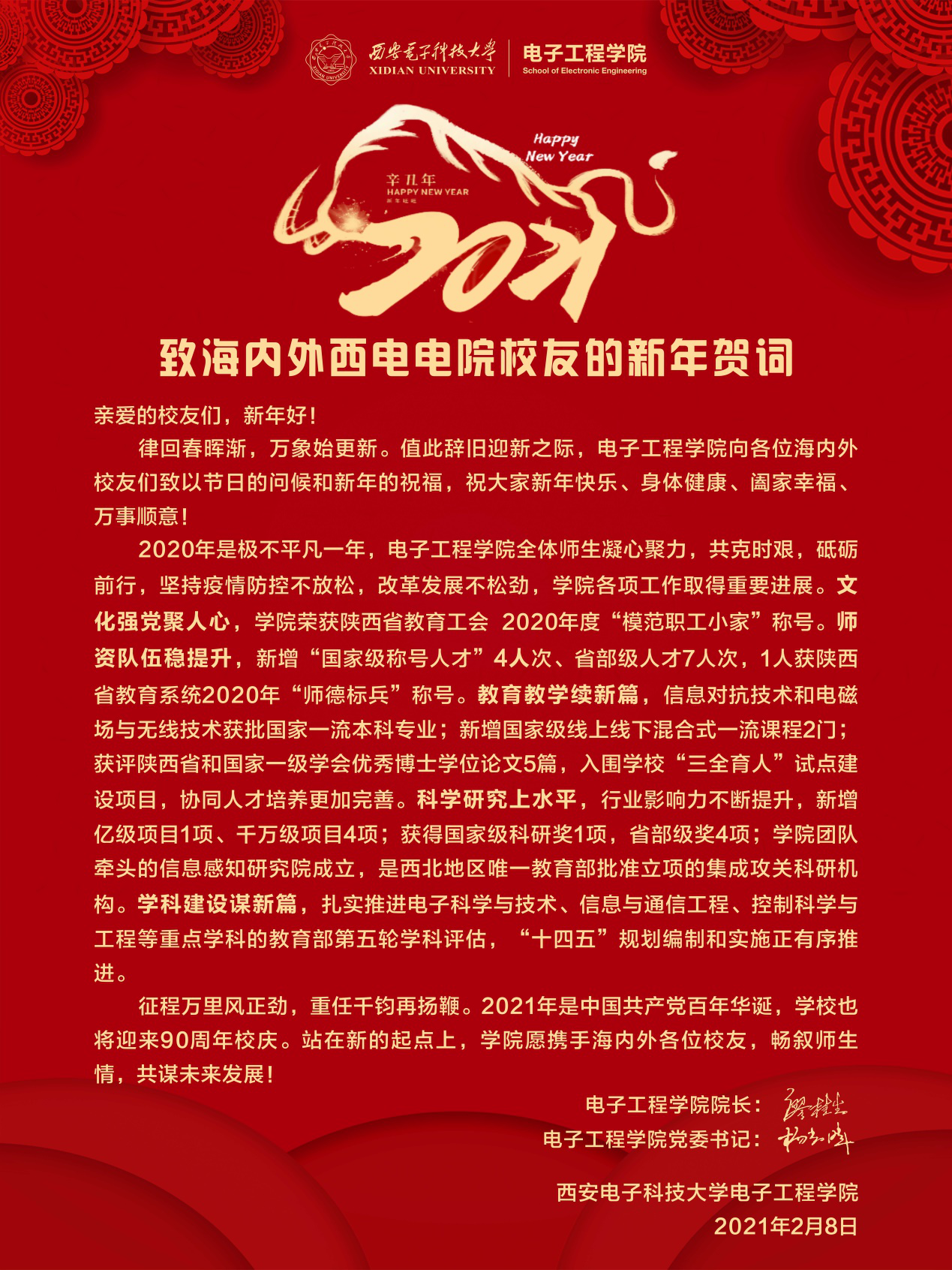 2020年是极不平凡一年,beat365全体师生凝心聚力,共克时艰,砥砺前行,坚持疫情防控不放松,改革发展不松劲,学院各项工作取得重要进展。文化强党聚人心,学院荣获陕西省教育工会 2020年度“模范职工小家”称号。师资队伍稳提升,新增“国家级称号人才”4人次、省部级人才7人次,1人获陕西省教育系统2020年“师德标兵”称号。教育教学续新篇,信息对抗技术和电磁场与无线技术获批国家一流本科专业;新增国家级线上线下混合式一流课程2门;获评陕西省和国家一级学会优秀博士学位论文5篇,入围学校“三全育人”试点建设项目,协同人才培养更加完善。科学研究上水平,行业影响力不断提升,新增亿级项目1项、千万级项目4项;获奖国家级科研奖1项,省部级奖4项;学院团队牵头的信息感知研究院成立,是西北地区唯一教育部批准立项的集成攻关科研机构。学科建设谋新篇,扎实推进电子科学与技术、信息与通信工程、控制科学与工程等重点学科的教育部第五轮学科评估,“十四五”规划编制和实施正有序推进。