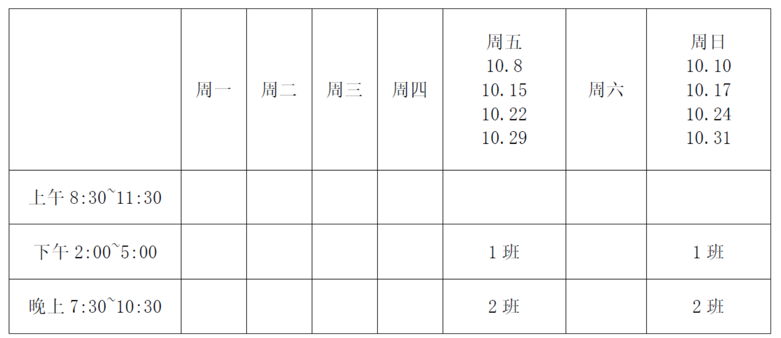 每个班每周上2次课,每次课4课时,总共4周,时间安排如下表。首次课为理论和概述课。