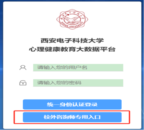 学生登录时,请选择校外咨询师专用入口,直接输入用户名及密码。用户名是考生准考证编号密码位身份证后6位,如最后一位是字母,请用数字“9”代替字母。