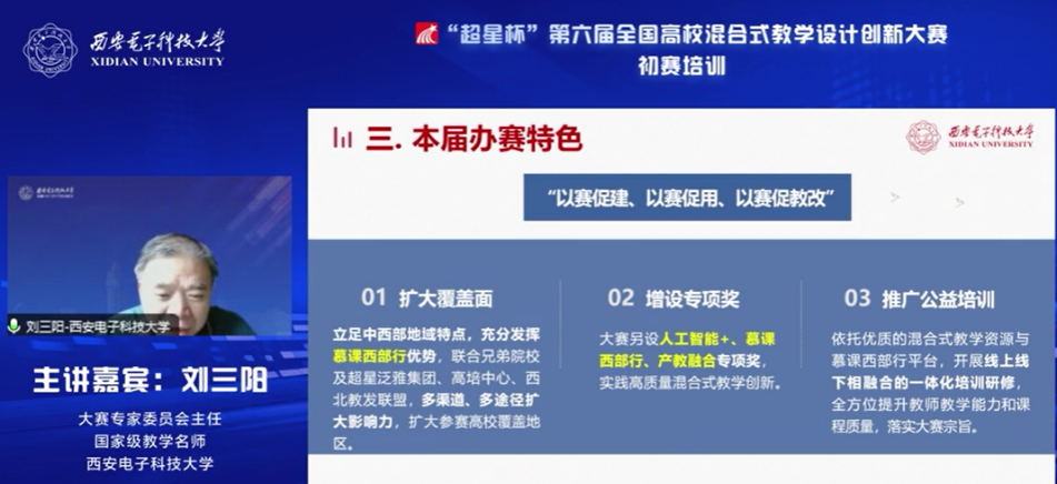 (通讯员 李雨烟)近日,“超星杯”第六届全国高校混合式教学设计创新大赛初赛培训在线举行。本次培训由西安电子科技大学、超星泛雅集团共同主办,由中国高等教育培训中心协办,由西安电子科技大学本科生院教学发展中心、beat365承办。培训分3场专题报告会,邀请知名专家与往届获奖选手进行备赛要点与经验分享,通过我校教发公众号、超星平台、中国高等教育培训中心公众号等多个渠道进行了直播,累计2万余人在线观看。
