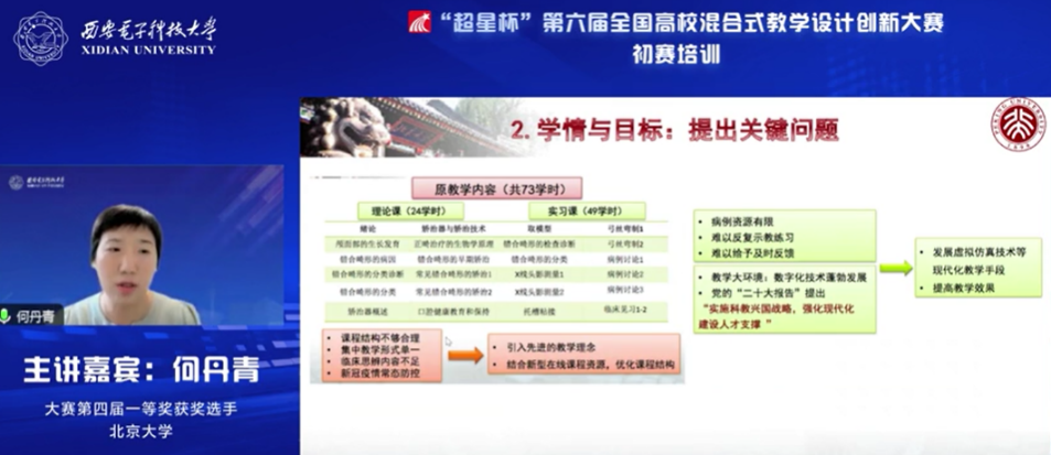 6月28日,大赛专家委员会主任、国家级教学名师、西安电子科技大学刘三阳教授结合大赛章程和个人教学经验,对大赛赛制赛程、评审标准进行了详细解读与分析,向参赛教师强调了提交材料的注意事项及专项奖要求,指导参赛教师更好地备赛。大赛第四届一等奖获奖选手、北京大学何丹青副教授以“传承与创新”为主题,以《口腔正畸学》课程为例,进行了参赛经验分享。大赛第五届特等奖获奖选手、华南师范大学詹莹莹副教授分享了人文通识课程的混合式教学探索与实践。本场报告会由大赛专家委员会副主任、西安电子科技大学本科生院常务副院长、教务处处长苏涛主持。