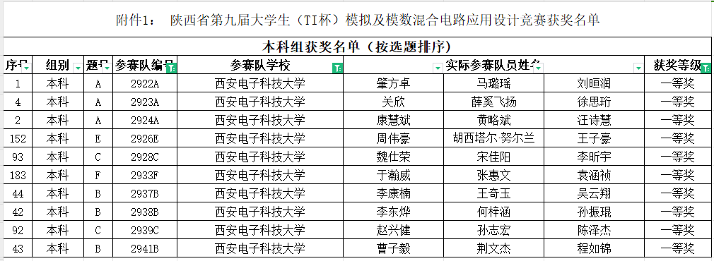 (通讯员 赵典)近日,陕西省教育厅、全国大学生电子设计竞赛陕西赛区组织委员会公布了2024年全国大学生电子设计竞赛陕西区赛(暨陕西省第九届大学生模拟及模数混合电路应用设计竞赛)获奖名单,beat365再创佳绩,获省一等奖10项,占全校省一等奖总数55%(全校共18项),创历史新高,获省二等奖8项,省三等奖8项,省一等奖数和获奖总数均为全校第一。 学院郭万有、王新怀、徐茵、王水平4位教师获得全国电赛陕西区赛优秀指导教师奖。