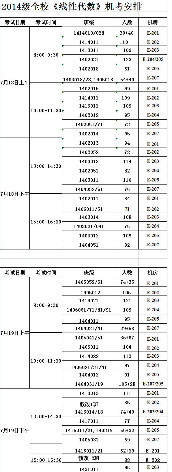 2014线性代数机考考场和时间安排