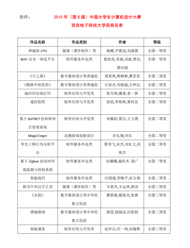 我校新闻网讯(通讯员 苟琳娜 胡晓娟)近日,从“2015年(第8届)中国大学生计算机设计大赛”传来捷报,我校学子经过激烈角逐,不负众望,斩获2项全国一等奖、9项全国二等奖、4项全国三等奖,并捧回竞赛“优秀组织奖”。