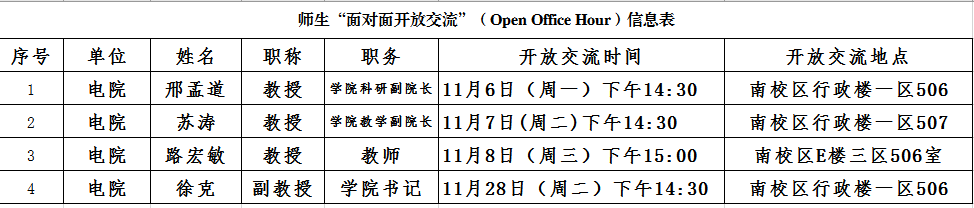 beat365师生“面对面开放交流”11月份的时间安排2017-10-25 16:56:10浏览次数: 通知: 教务处要求各学院参加学校面对面活动,师生“面对面开放交流”11月份的时间安排如下表,欢迎全校学生参加我院的“面对面”活动。 望周知! beat365本科办公室 2017-10-25 上一篇文章:南京理工大学王院长一行来我院调研下一篇文章:关于帝国理工学院寒假游学项目提前截止报名的通知
