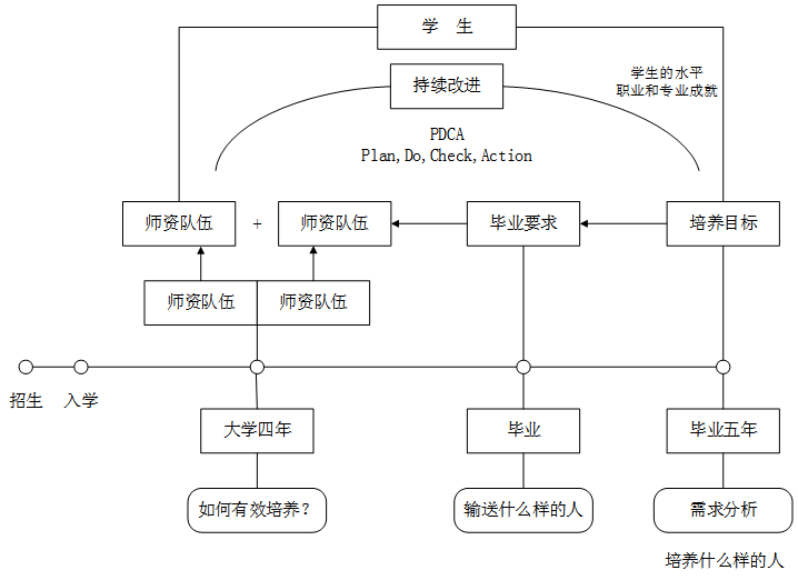 本科毕设论文应该是具有论文框架结构和研究路线的工作报告,本科毕设在认证体系中是“课程体系”的重要组成部分。基于认证产出导向(OBE)理念,人才培养必须以“学生”为中心;其过程是逆向设计的,首先明确“培养目标”,即本科生毕业5年后可以达到的标准;倒推“毕业要求”,即毕业时应该具有的水平——毕业要求是对全体合格毕业生的最低标准,各专业可以高于认证规定的最低标准,这也就是对本科生工程知识、问题分析、设计开发、研究、使用工具、工程社会、环境发展、职业规范、个人团队、沟通、项目管理和终生学习这12个方面的基本要求;为了达到毕业要求,需要“课程体系”的支撑,课程体系需要从传统知识为核心转变到以能力为核心的构建方式,每一门课程或者教学环节基本目标是达成毕业要求细分的某一个或某几个指标点,使得学生获得某些知识、能力和素质训练,并达到要求程度;课程体系的实现进一步需要“师资队伍”和“支持条件”的保障和推进;认证体系是为了保障人才培养质量,要对质量的控制和改进机制,整体体系和每一个环节都应该遵循PDCA循环,即计划、执行、评估和改进循环,实现“持续改进”。