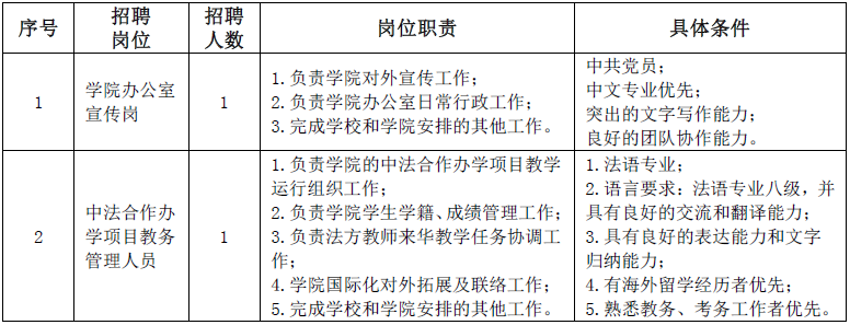 1.学历要求。学院办公室宣传岗要求硕士及以上学历;中法合作办学项目教务管理人员要求本科及以上学历。