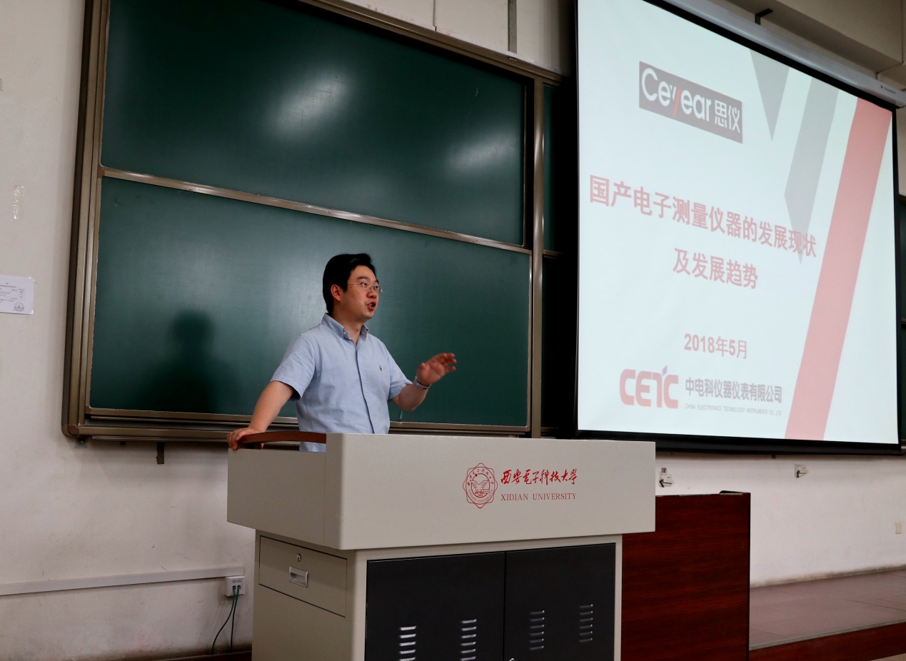 【新闻稿:通讯员 马超】应电磁场与微波技术实验教学省级示范中心马超老师的邀请,2018年5月17日下午两点四十五分,在新校区B楼437阶梯教室,中电41研究所高级工程师李剑锐的《国产电子测量仪器的发展现状及发展趋势》学术讲座如期举行。来自15级13,14,61班约两百余名学生到场聆听了讲座。电信工程系主任李龙教授亲临讲座并开场介绍了李剑锐高工、讲座内容及对于微波测量课程的重要性。