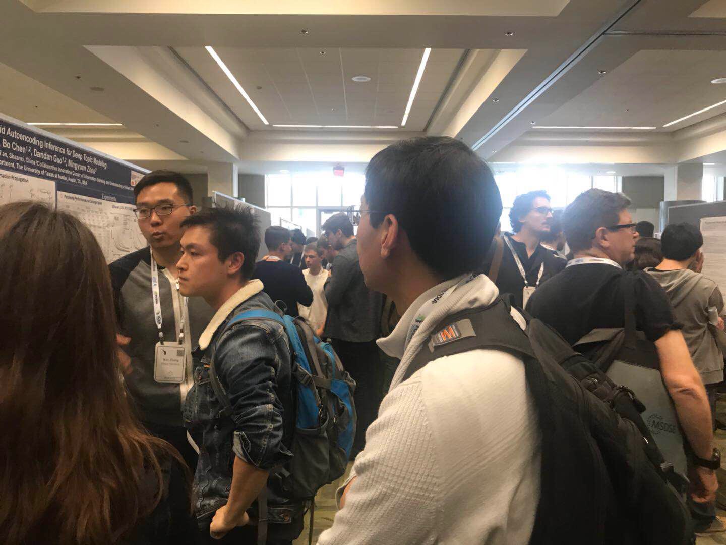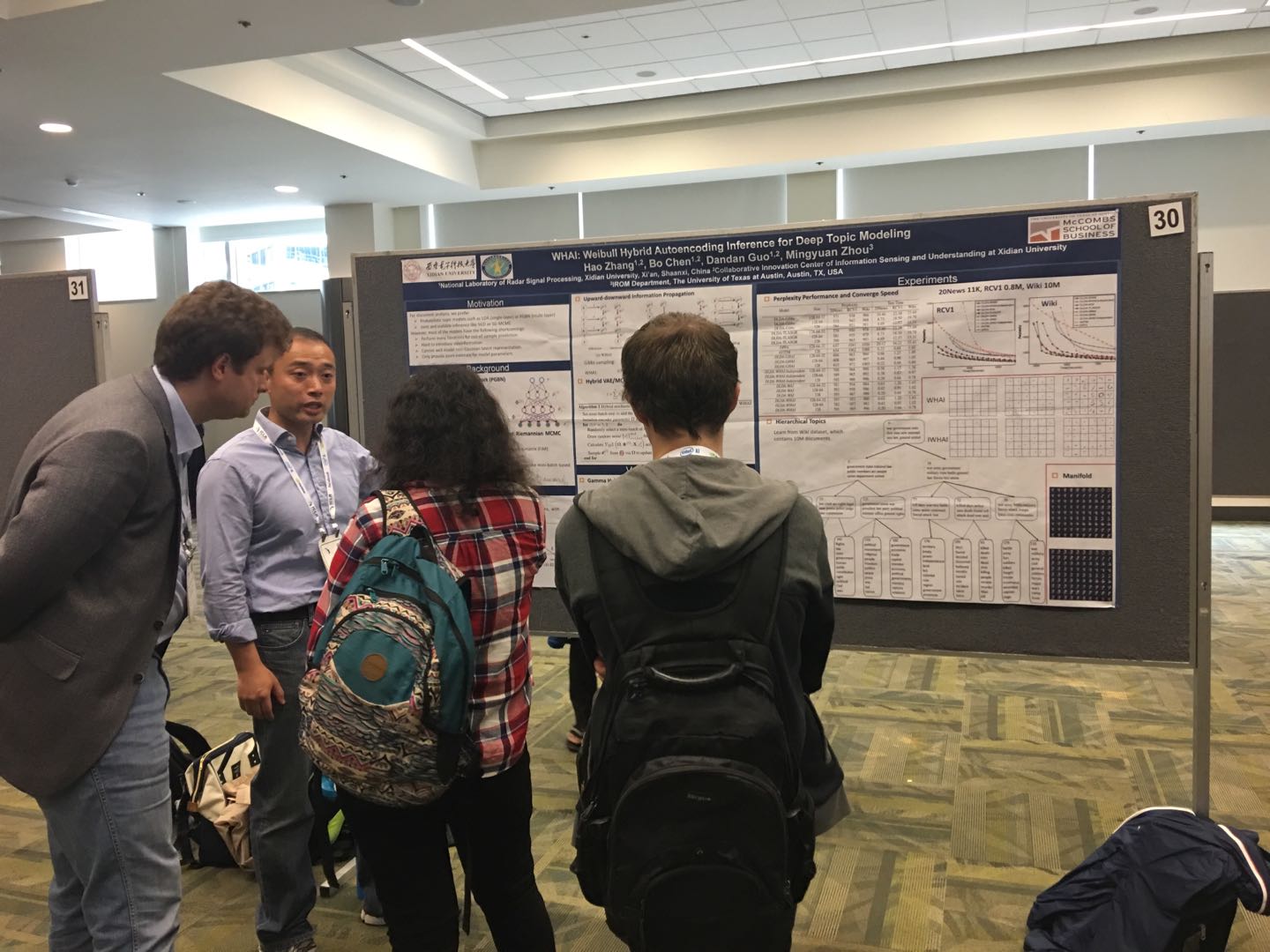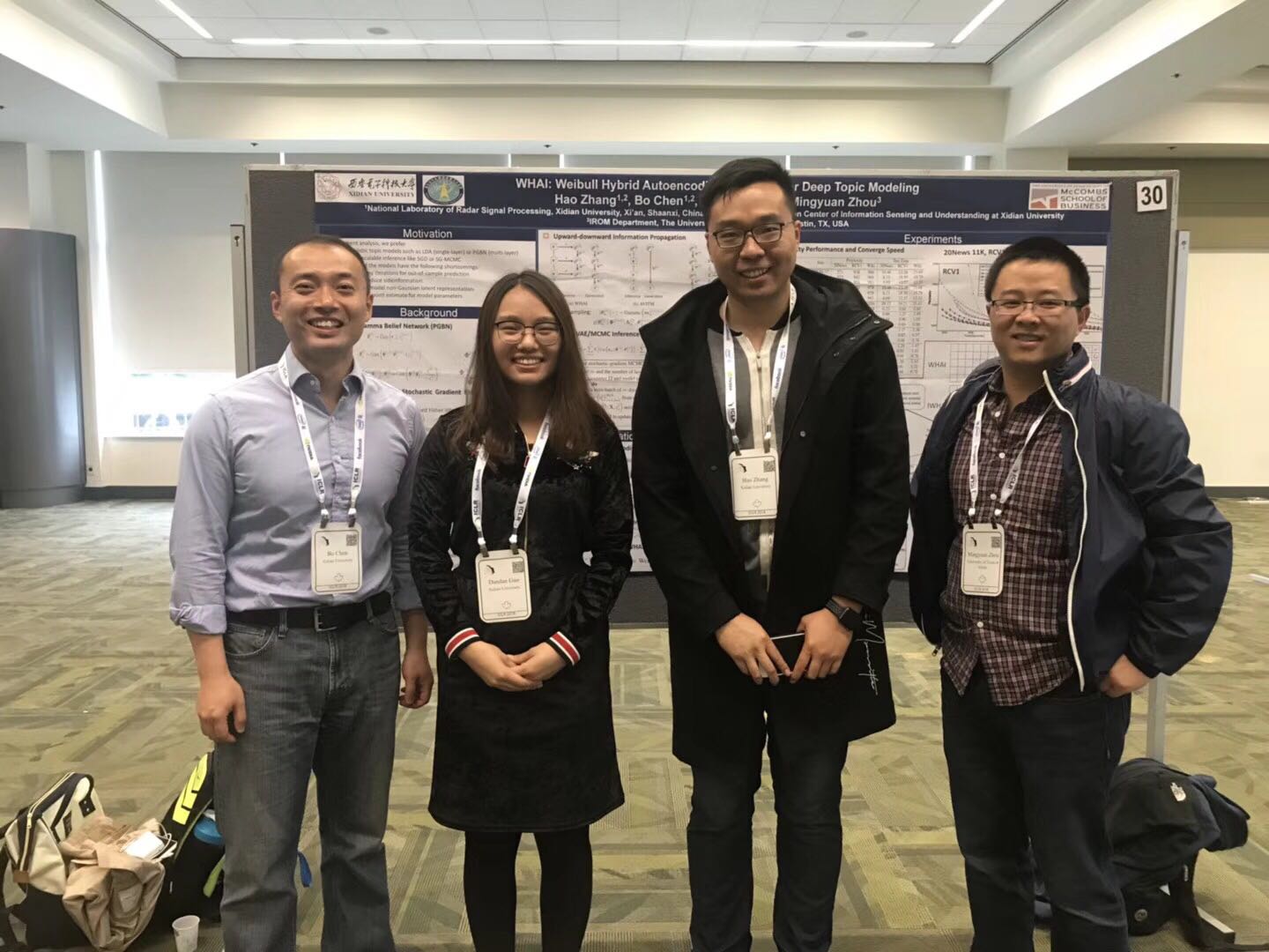 今年,我校雷达信号处理国家级重点实验室陈渤教授指导的博士生张昊和郭丹丹,提出了适用于深度主题模型的威布尔混合自编码推理方法的相关论文,“WHAI: Weibull Hybrid Autoencoding Inference for Deep Topic Modeling”,并被会议录用,这也是我校学生首次作为第一作者的论文发表在ICLR大会上,并做相关poster展示。该工作延续了团队与德州大学奥斯汀分校(UTAustin)周名远教授合作的,分别发表于NIPS2015的深度概率统计模型和ICML2017的针对大数据的概率统计深层网络快速学习方法的研究成果,聚焦于概率统计深层网络在测试阶段的快速学习和扩展到大数据的问题。该工作所提出的模型,首先利用威布尔分布逼近伽马分布,以此可从均匀分布中采样噪声得到简单的重参技术, 之后联合随机梯度马尔科夫链蒙特卡洛方法和变分自编码方法获得针对深层文本模型的混合自编码推理方法,实现了在测试阶段中大数据背景下直接通过网络映射快速得到样本的特征,显著提升了概率深度网络的实用性。通过该次大会,一方面展示了雷达信号处理国家级重点实验室师生在机器学习和深度网络领域的研究能力和成果,扩大了实验室的学术影响力,同时也有助于实验室与该领域顶尖学者的交流以及对该领域最新研究进展的了解。
