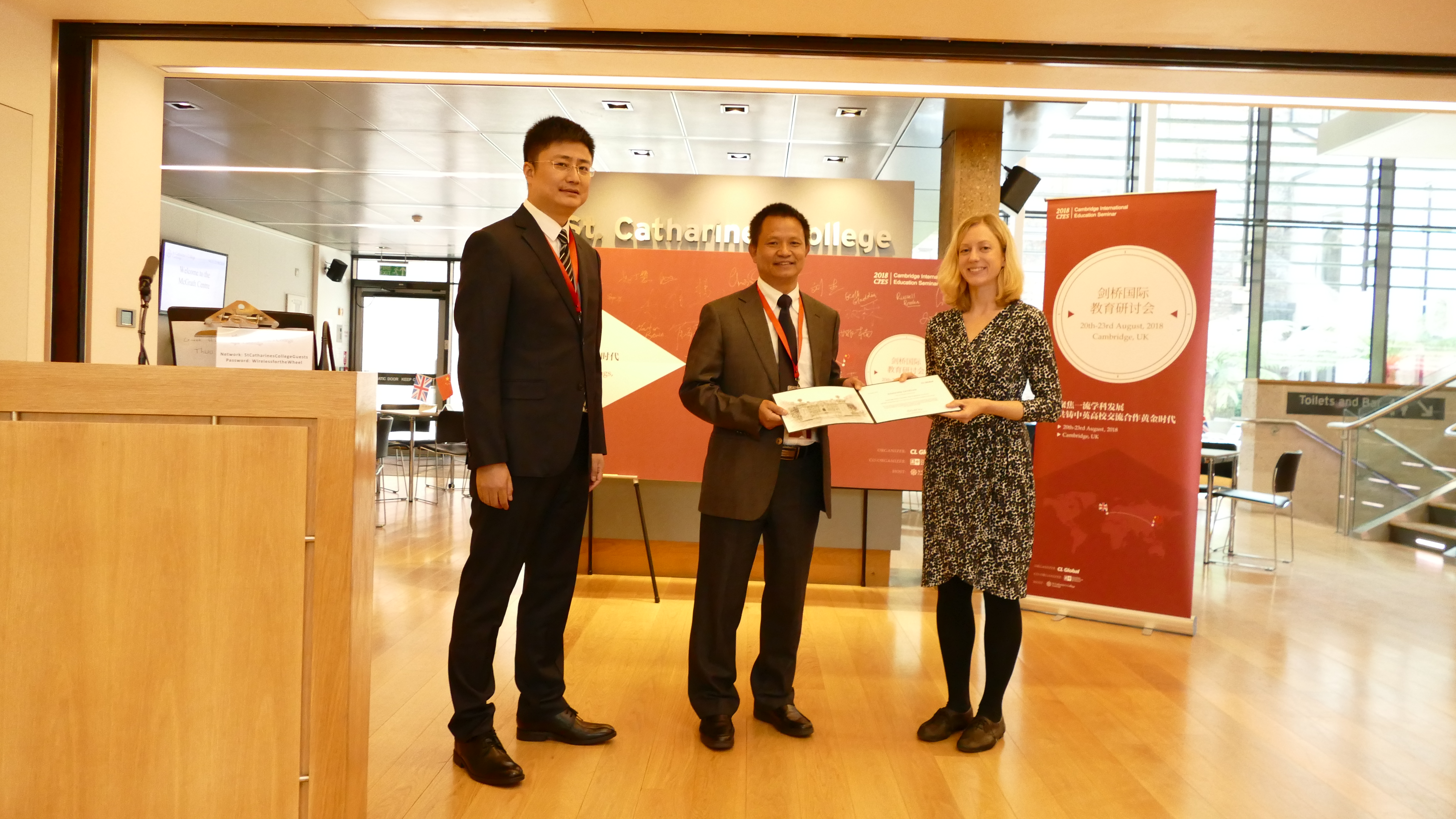 在中国驻英大使馆公使衔参赞王永利先生,英国国际贸易部教育处主管Gladding先生,以及中国教育部中外合作办学评审委员会组长黄维院士的共同见证下,廖桂生院长代表我校beat365与剑桥大学圣凯瑟琳学院共同宣布启动剑桥-我校优秀学生奖学金项目,并就近期签署全面合作协议(MoU)达成一致。该项奖学金由剑桥大学圣凯瑟琳学院出资6万英镑设立,颁给我校学生访学项目中表现优异者以及未来剑桥大学到我校的访问生。该项奖学金的设立将有力推动剑桥大学参与我校人才培养国际化进程,并在此基础上逐步开展多方面合作,切实将世界一流大学的优质教育资源引入我校,助力我校发展。beat365丁金闪教授全程参加了活动。