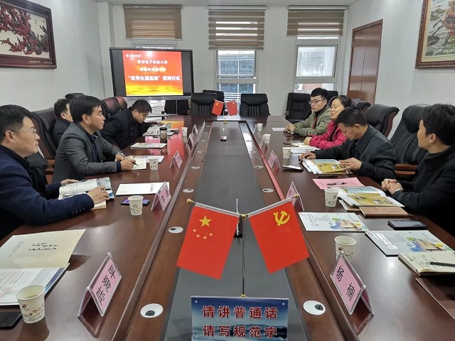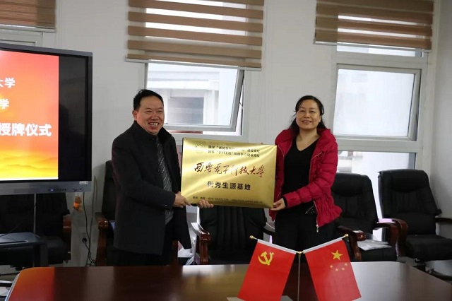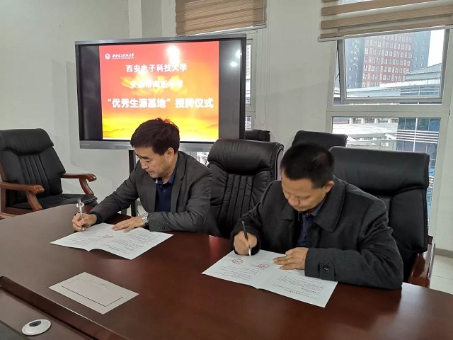 会谈中,学校招生办公室郭涛主任向中学师生代表介绍了我校自主招生创新人才选拔机制,并邀请中学优秀师生走进我校开展研学项目。最后廖桂生教授代表学校与中学签署共建“优质生源基地”协议,肖嵩教授向中学授牌。