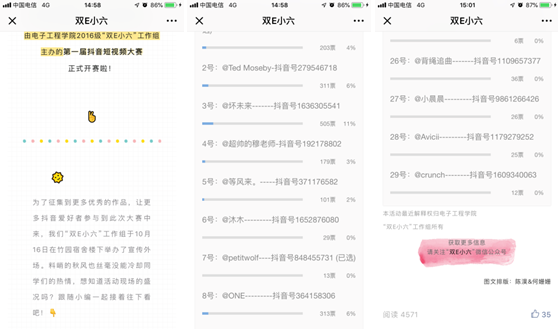 整个活动历时两个月,我院2016级高度重视,成立“双E小六”专项工作组,开设系列活动专项公众号,力争以学生喜闻乐见的形式,将思政工作像“盐”一样融入学生日常生活中。系列活动定期开展工作推进会,让学生真正参与到活动中,在活动中寓教于乐,在活动中有所收获,在活动中得到锻炼。