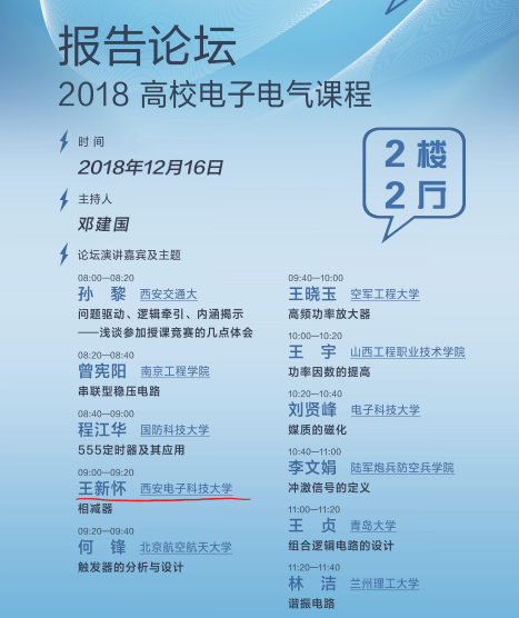 大会邀请了全国青年教师讲课竞赛一等奖头魁们做分会场报告,包括模拟电子技术基础、数字电子技术基础、低频电子线路、高频电子线路、数字电路与逻辑设计、电磁场与电磁波、信号与系统等各课程方向。我校获奖的王新怀副教授应邀参加,并做了讲课竞赛分享报告。他以模电中典型的运算放大器相减器电路为例,以实际应用问题为驱动,以如何构造相减器为逻辑牵引,逐次递进展示相减器的讲法,并结合虚拟仿真软件Multism仿真以加深内容理解。报告展示中以新颖的教学设计、先进的教学理念和方法、良好的教学能力与综合素养以及多种教学方法的融合运用,赢得了全国同行与点评专家的认可与肯定,展现了我校青年教师扎实的业务能力和专业素养。