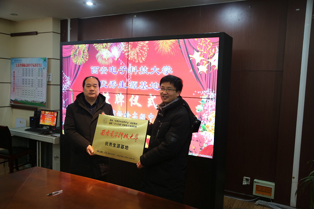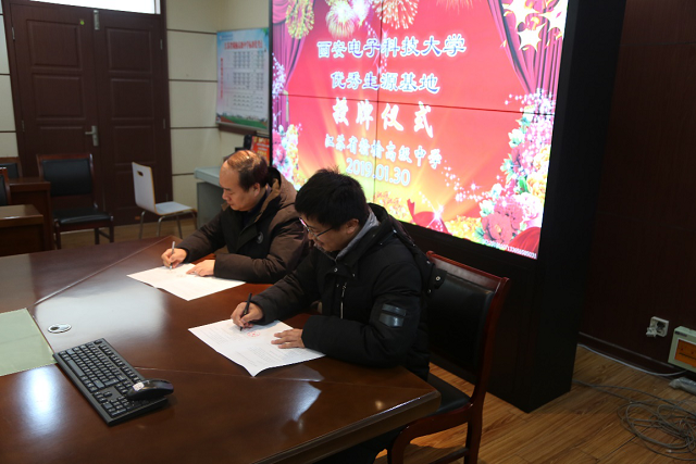 招生宣传小组与相关校领导进行了沟通和会谈,就我校生源地基地建设的目标、形式等方面与江苏赣榆高级中学达成了合作意向,顺利签订了“西安电子科技大学优秀生源基地”协议书,会谈双方举行了授牌仪式。